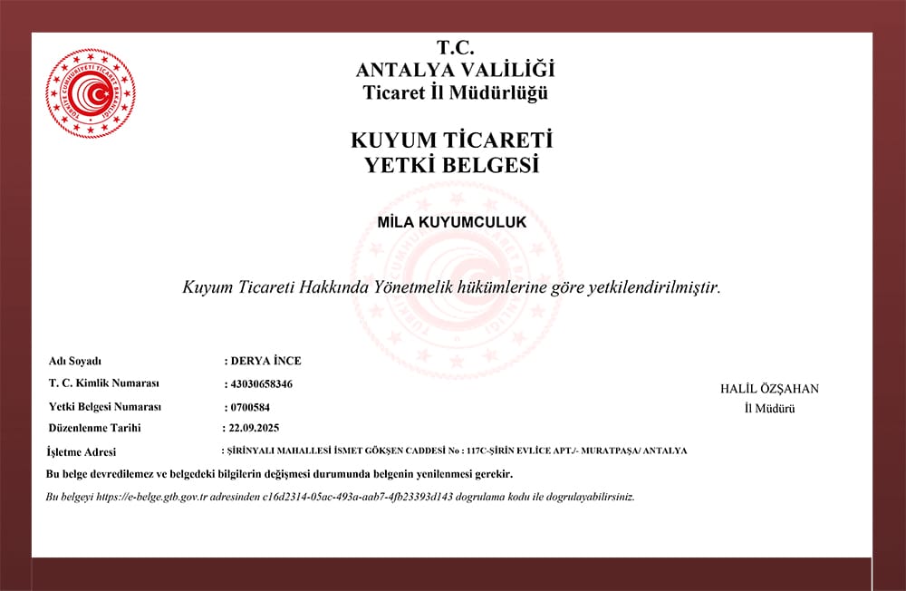 Kuyumculuk sektöründe güven, yılların birikimi ve dürüst iş anlayışıyla kazanılır. Biz de bu bilinçle, şeffaf fiyatlandırma politikamız ve kalite garantimizle sizlere en iyi hizmeti sunmayı ilke edindik. Her ürünümüz, titiz işçilik süreçlerinden geçerek elinize ulaşır ve uzun yıllar değerini korur.